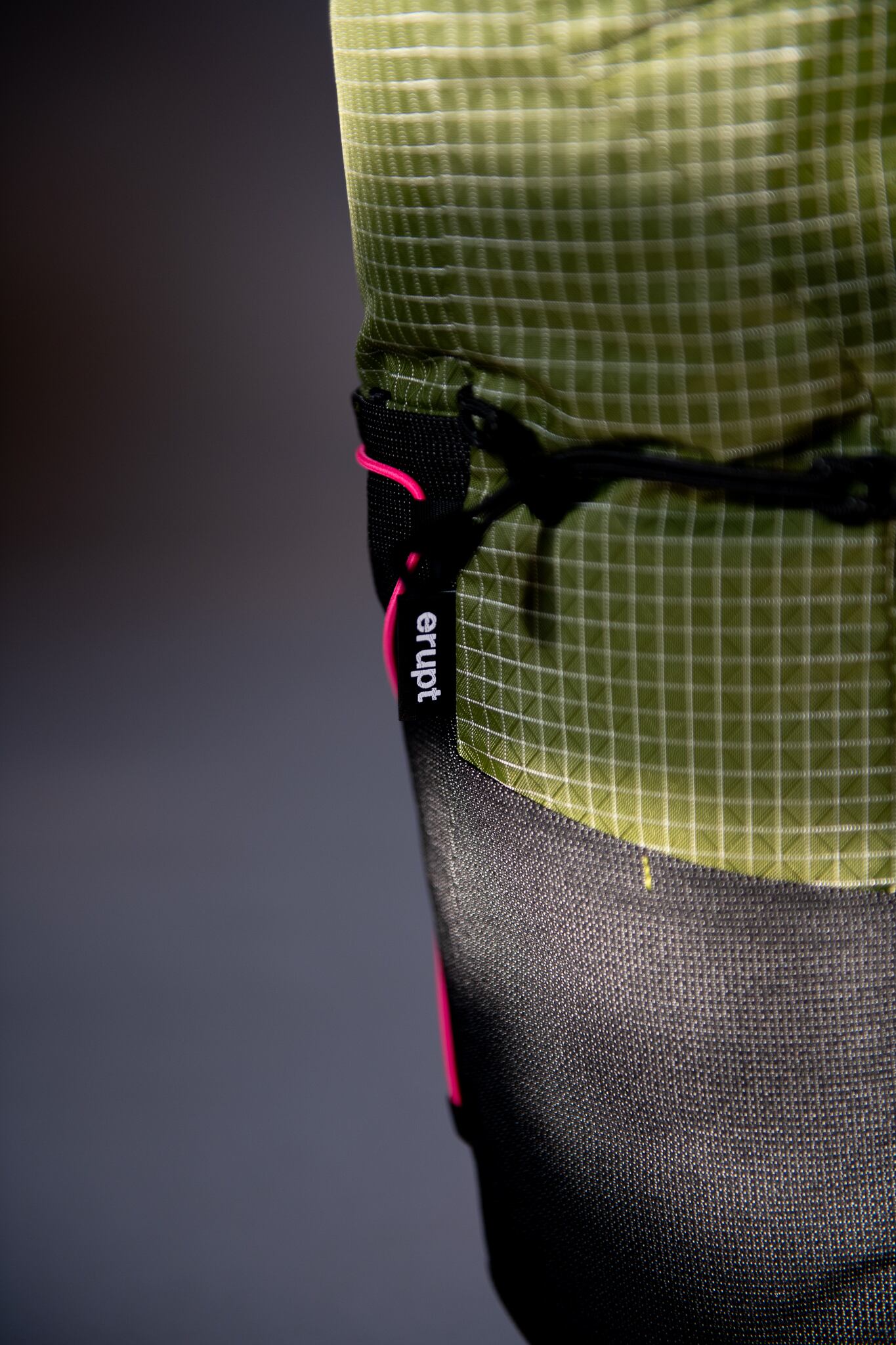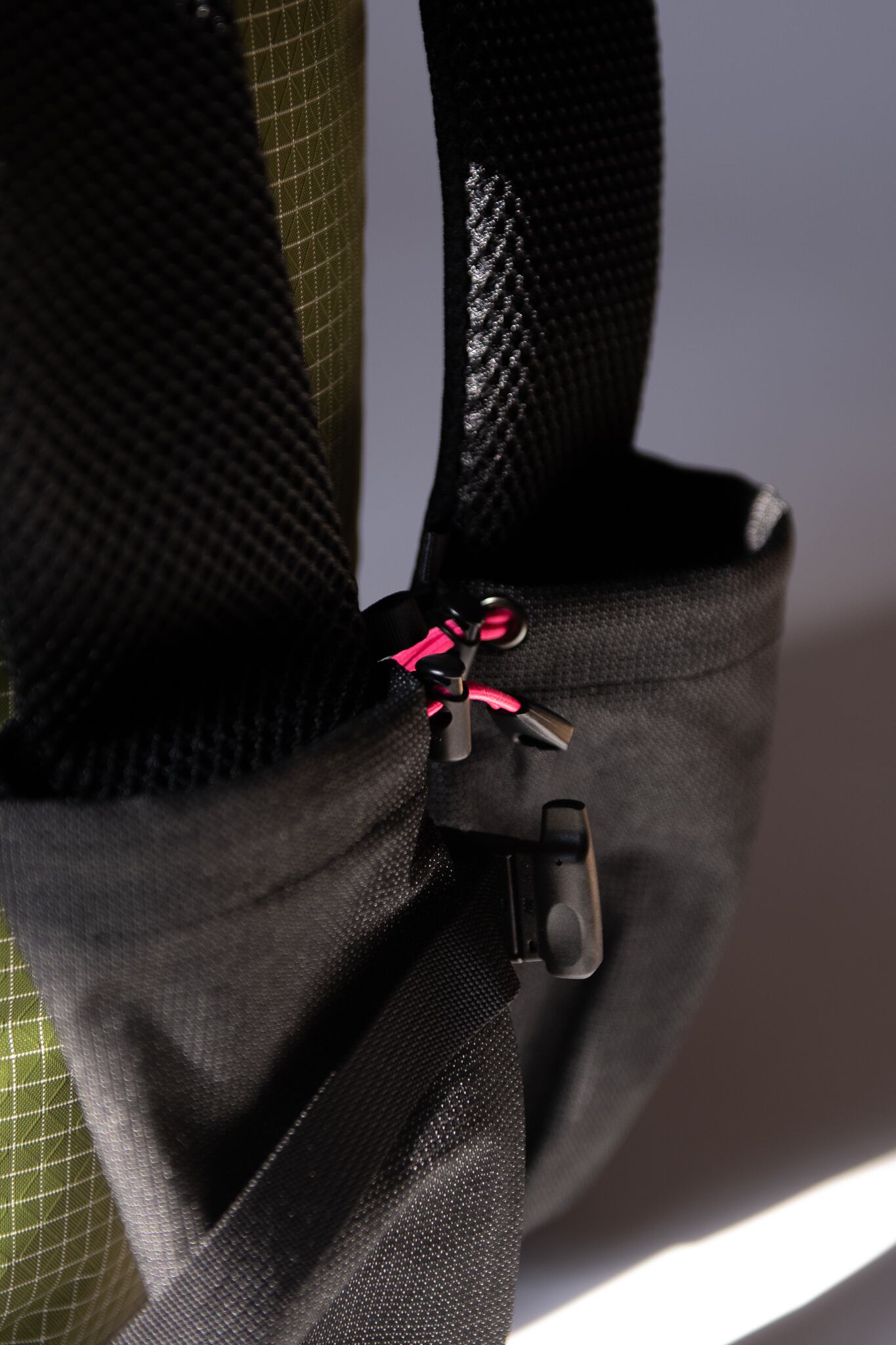 ショルダーのストレッチメッシュのポケットは、コードを締め上げることでボトルが抜け落ちることを防ぐ。