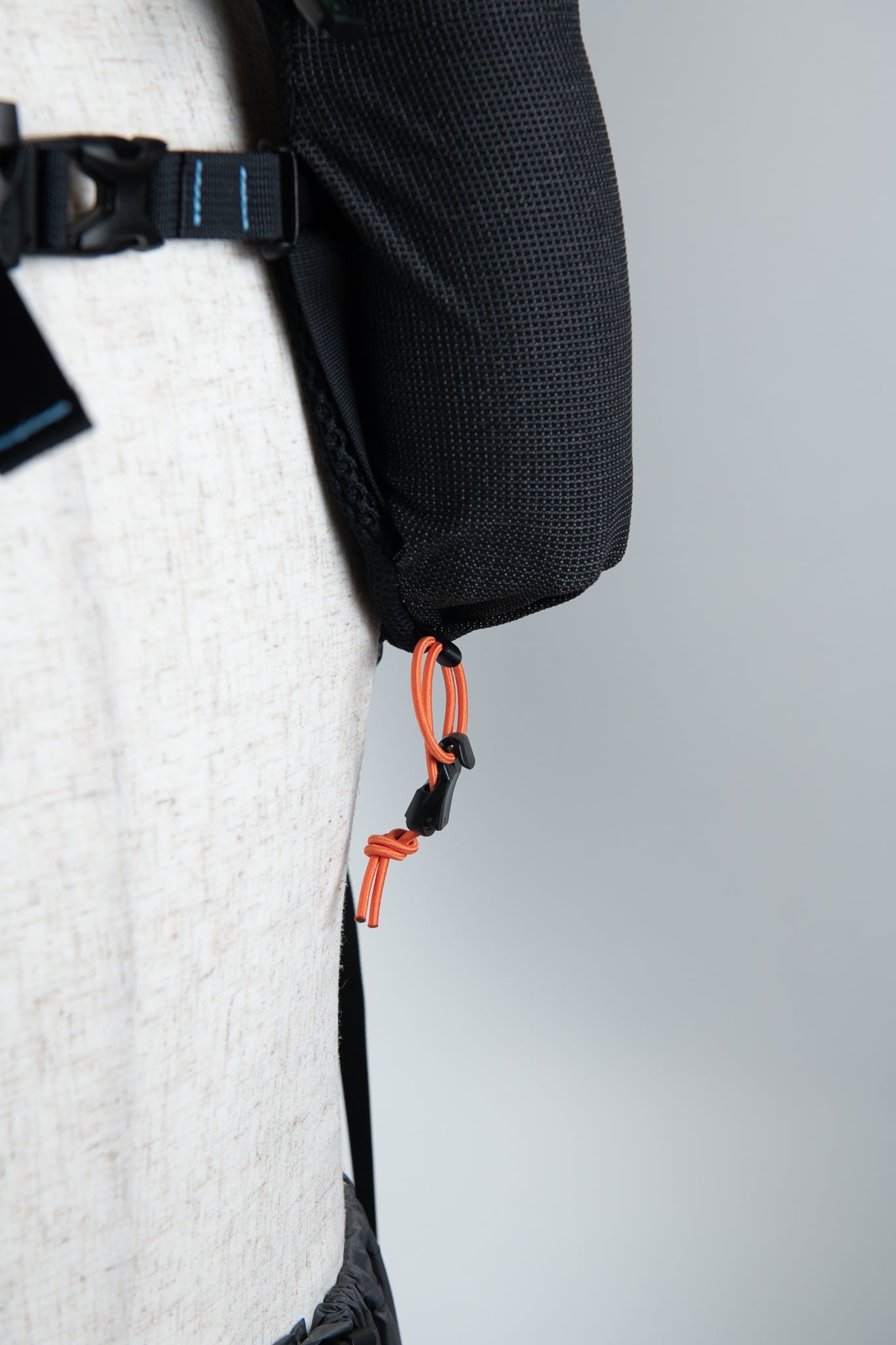 ショルダーのストレッチメッシュのポケットは、コードを締め上げることでボトルが抜け落ちることを防ぐ。