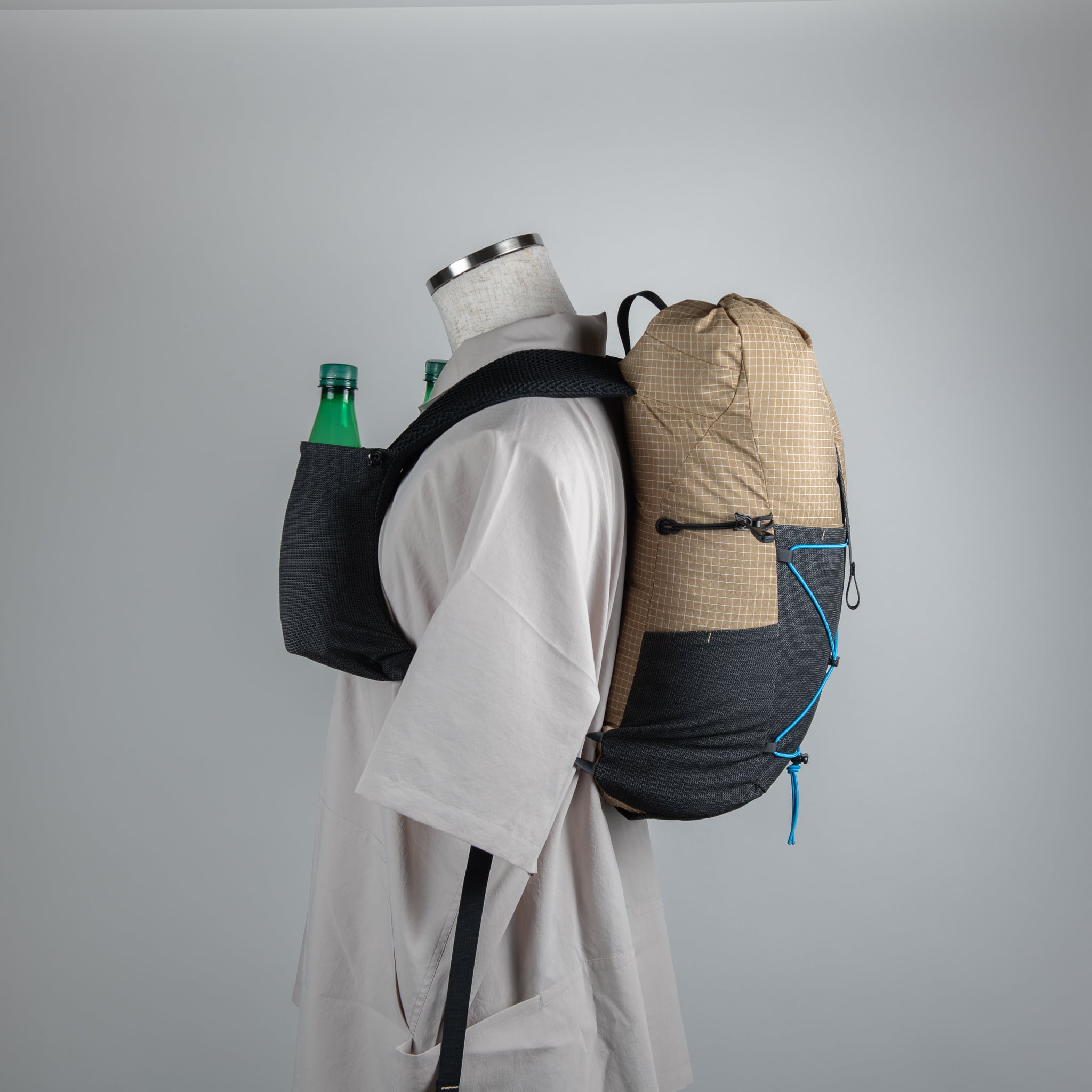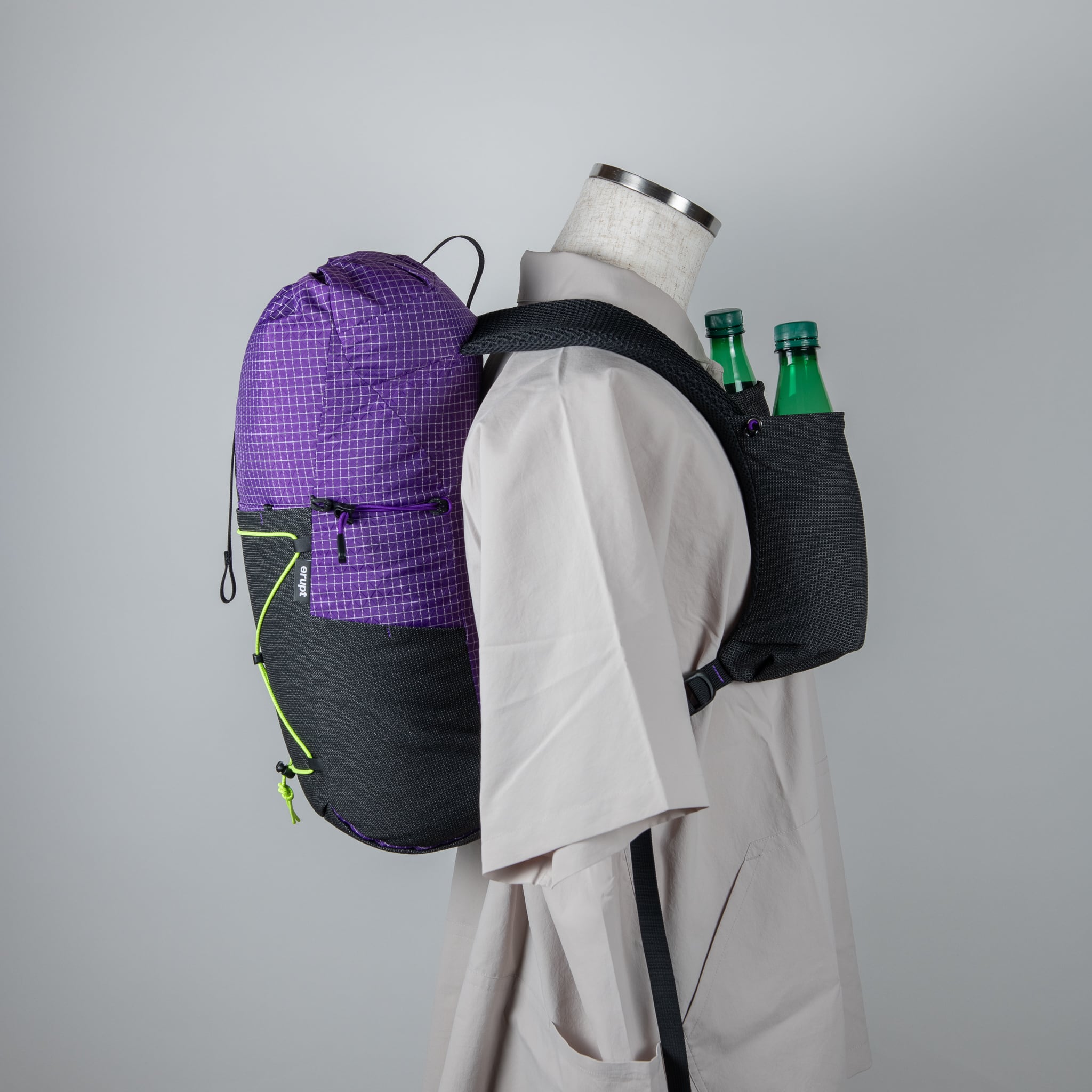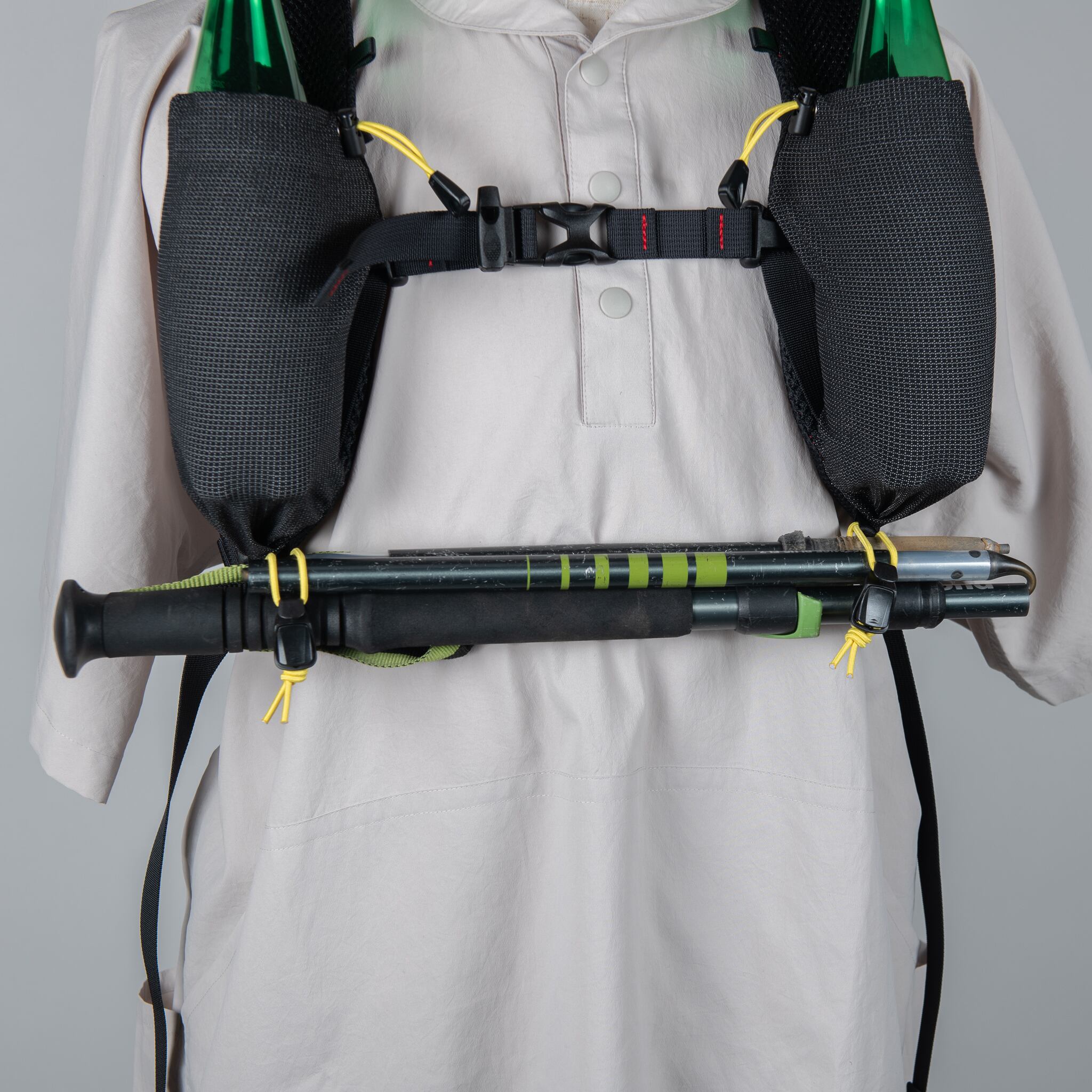 ショルダーのストレッチメッシュのポケットは、コードを締め上げることでボトルが抜け落ちることを防ぐ。